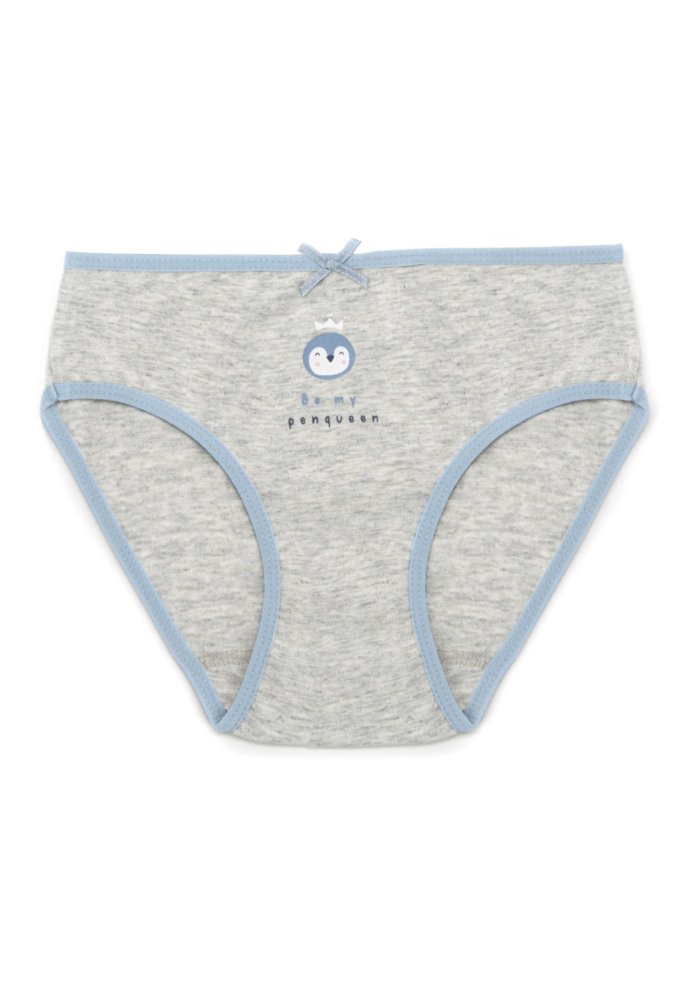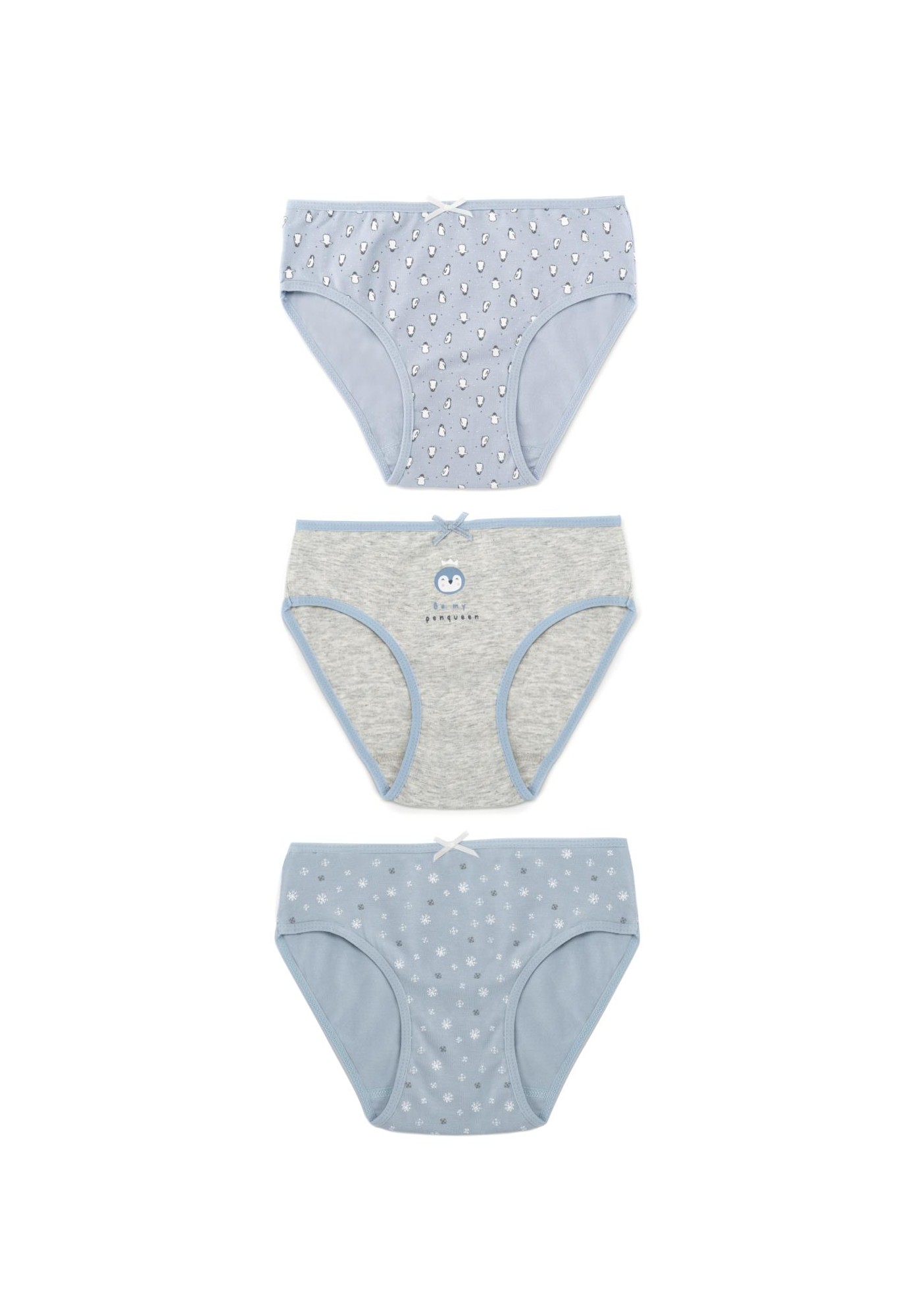 Pack de tres braguitas de niña estampado con pingüinos en color azul. Confeccionado en algodón elástico muy suave y agradable.