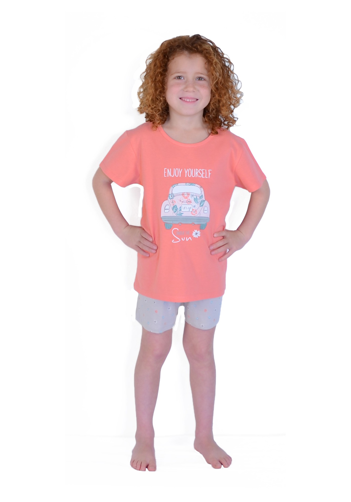 Pijama de verano de niña de dos piezas "Sunflowers", de manga corta y pantalón corto en color coral y piedra. Camiseta de cuello redondo con divertidos estampados de motivos estivales.