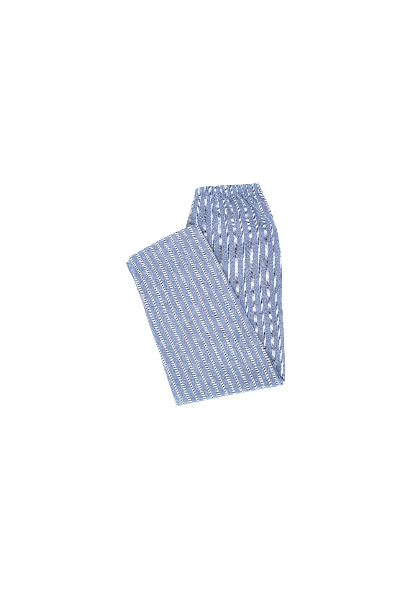 Pijama de niña de dos piezas de invierno de género de punto. Camiseta gris con letras y dibujos estampados en el centro. Pantalón listado azul de doble raya blanca. Camiseta de cuello redondo sin puños.