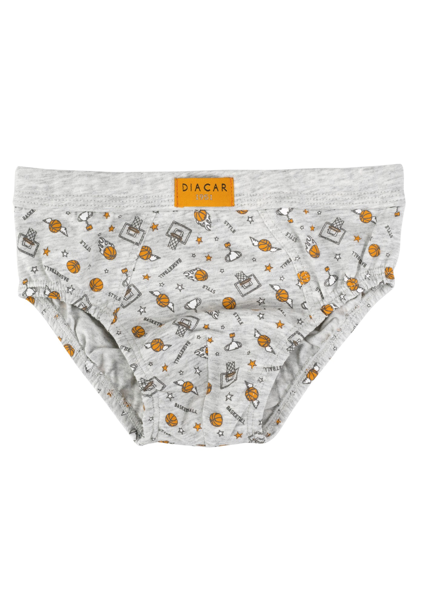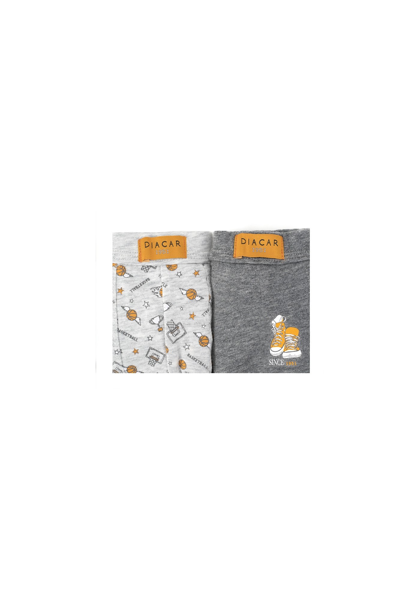 Pack de dos slips para niño de algodón elástico con motivos deportivos en gris y naranja. Suaves y adaptables.