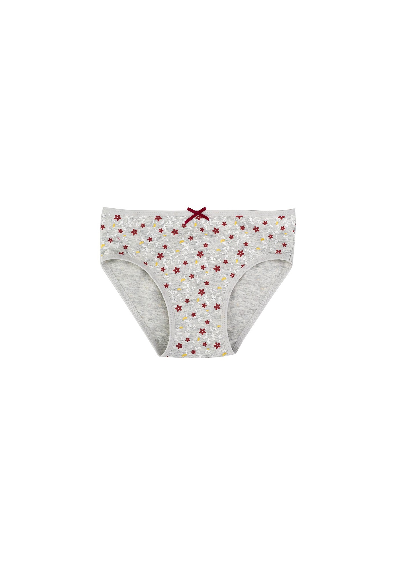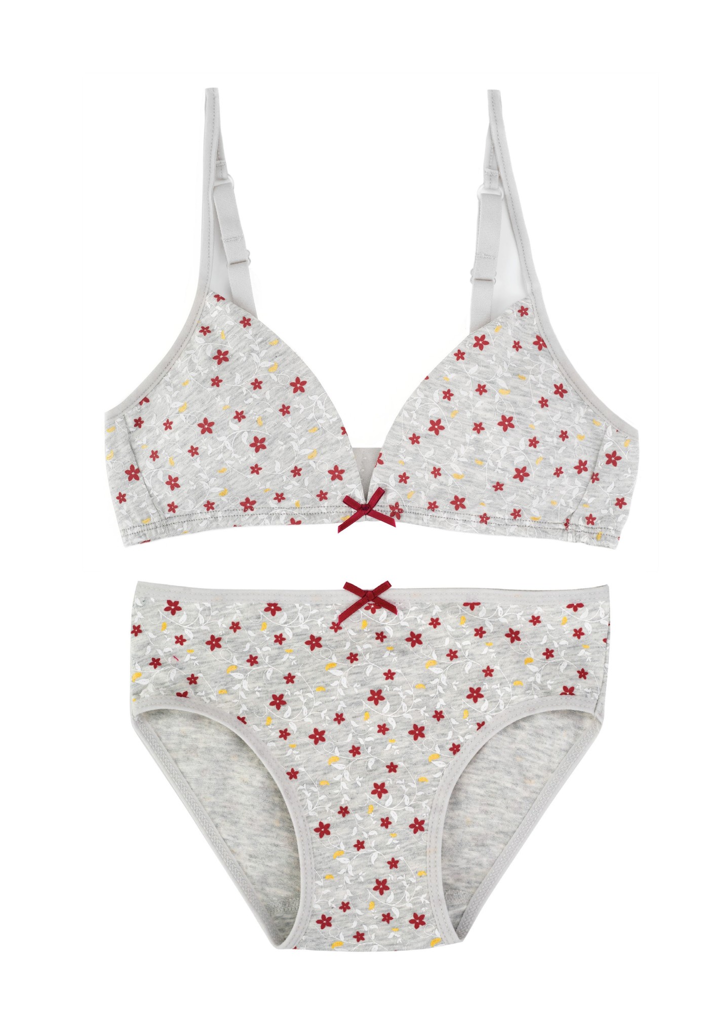 Conjunto de sujetador y braga para niñas confeccionado en suave algodón elástico con estampado de flores granates y doradas.