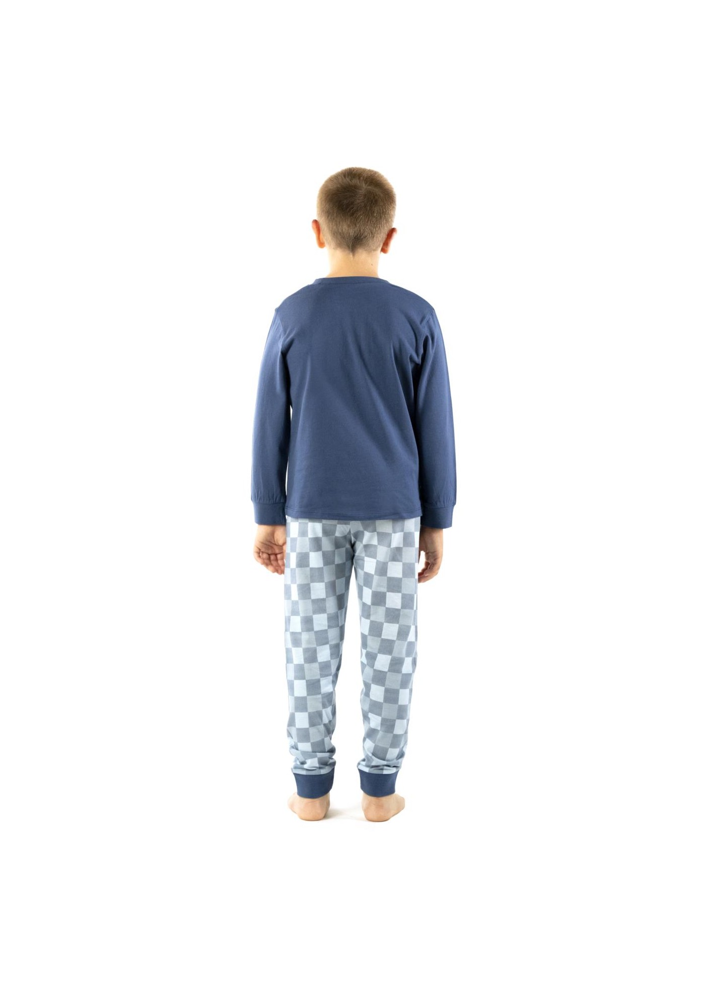 Pijama de niño de dos piezas con camiseta lisa de manga larga combinado con pantalón estampado a cuadros de ajedrez en color azul. 100º/ₒ Algodón - Single Jersey