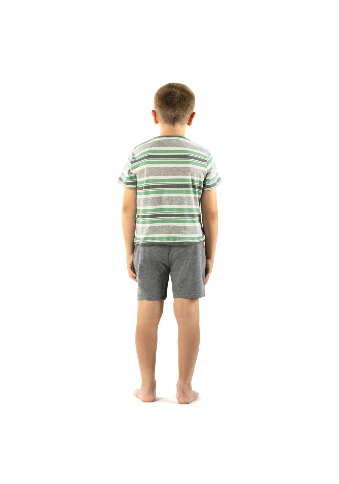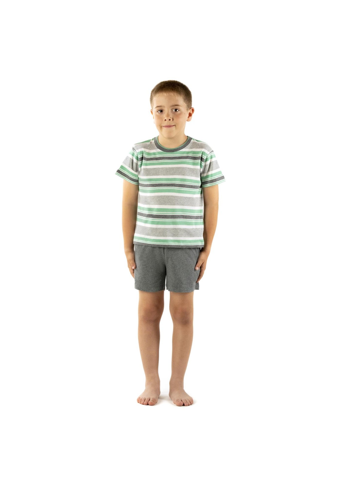 Pijama de niño de dos piezas con camiseta de manga corta a rayas combinado con shorts lisos en color verde y gris. 100º/ₒ Algodón - Single Jersey
