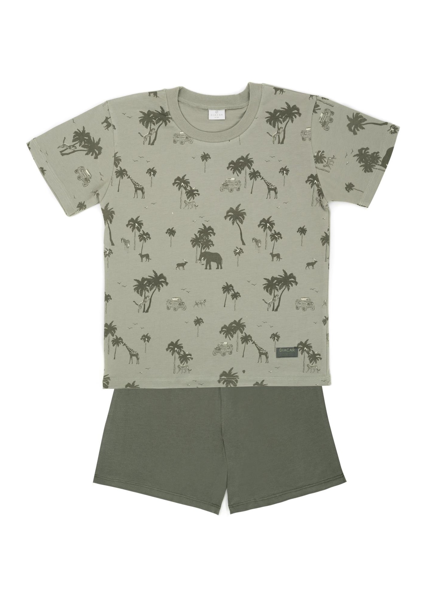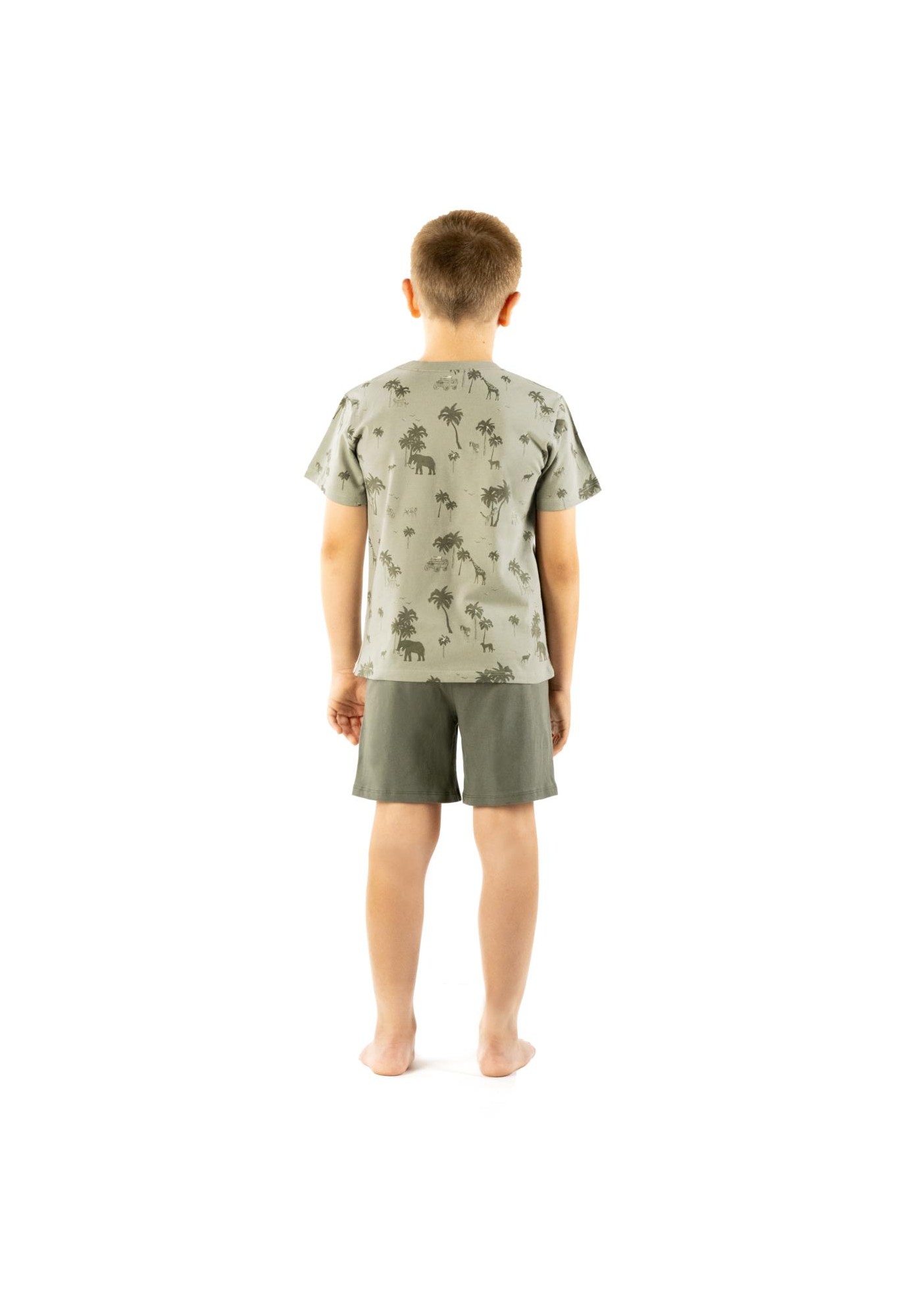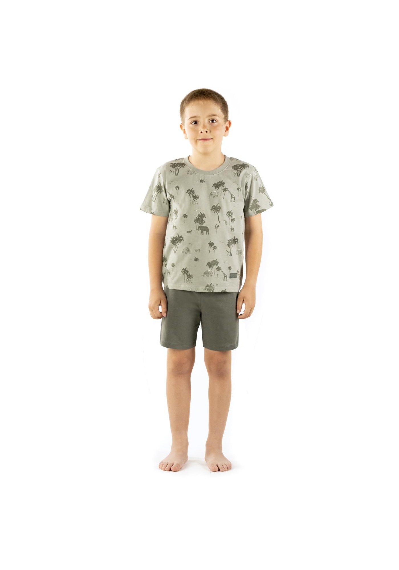 Pijama de niño de dos piezas con camiseta de manga corta estampada con dibujos de safari combinado con pantalón corto liso en color verde. 100% Algodón - Single Jersey