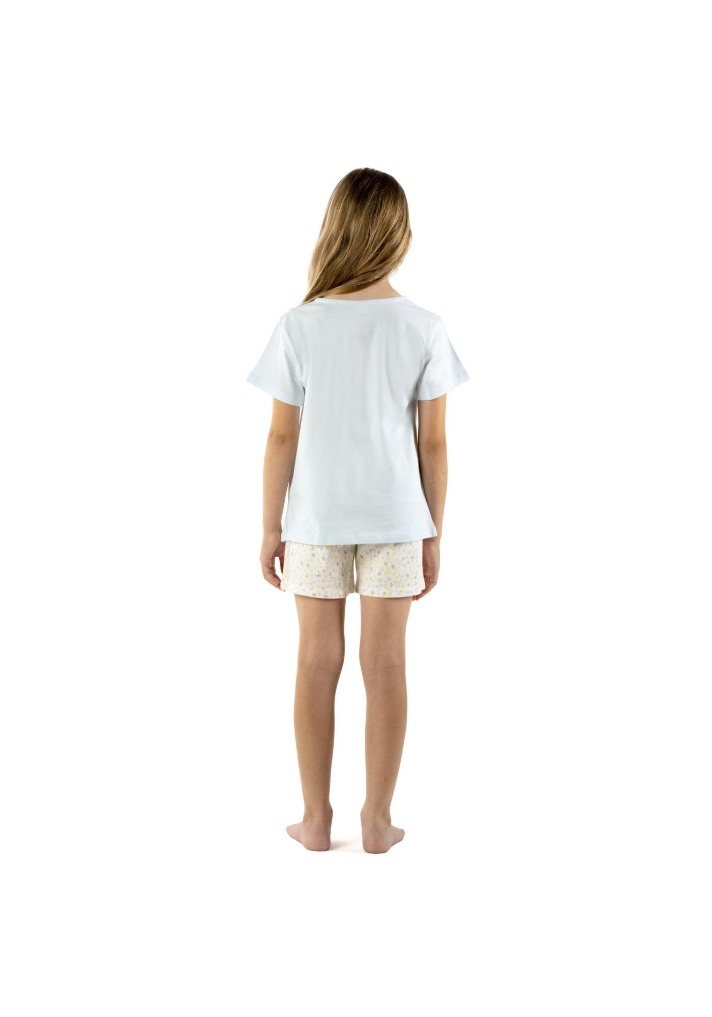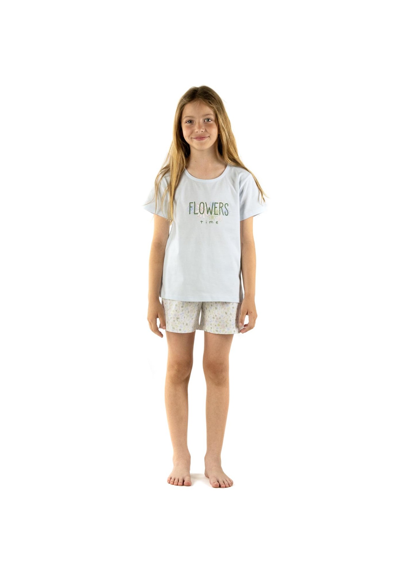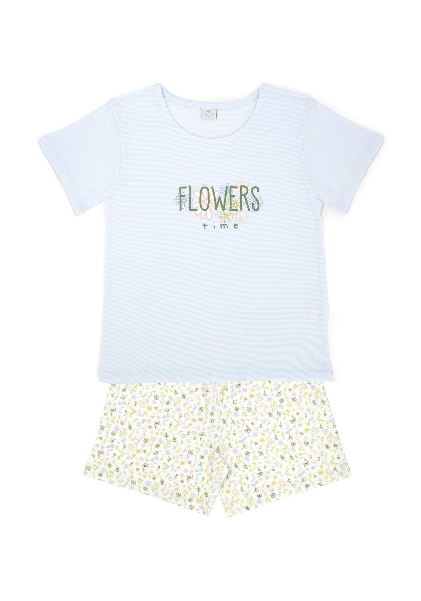 Pijama de niña confeccionado en género de punto con flores estampadas y letras grandes en color azul y cava. Pijama de manga y pantalón cortos 100º/ₒ Algodón - Single Jersey