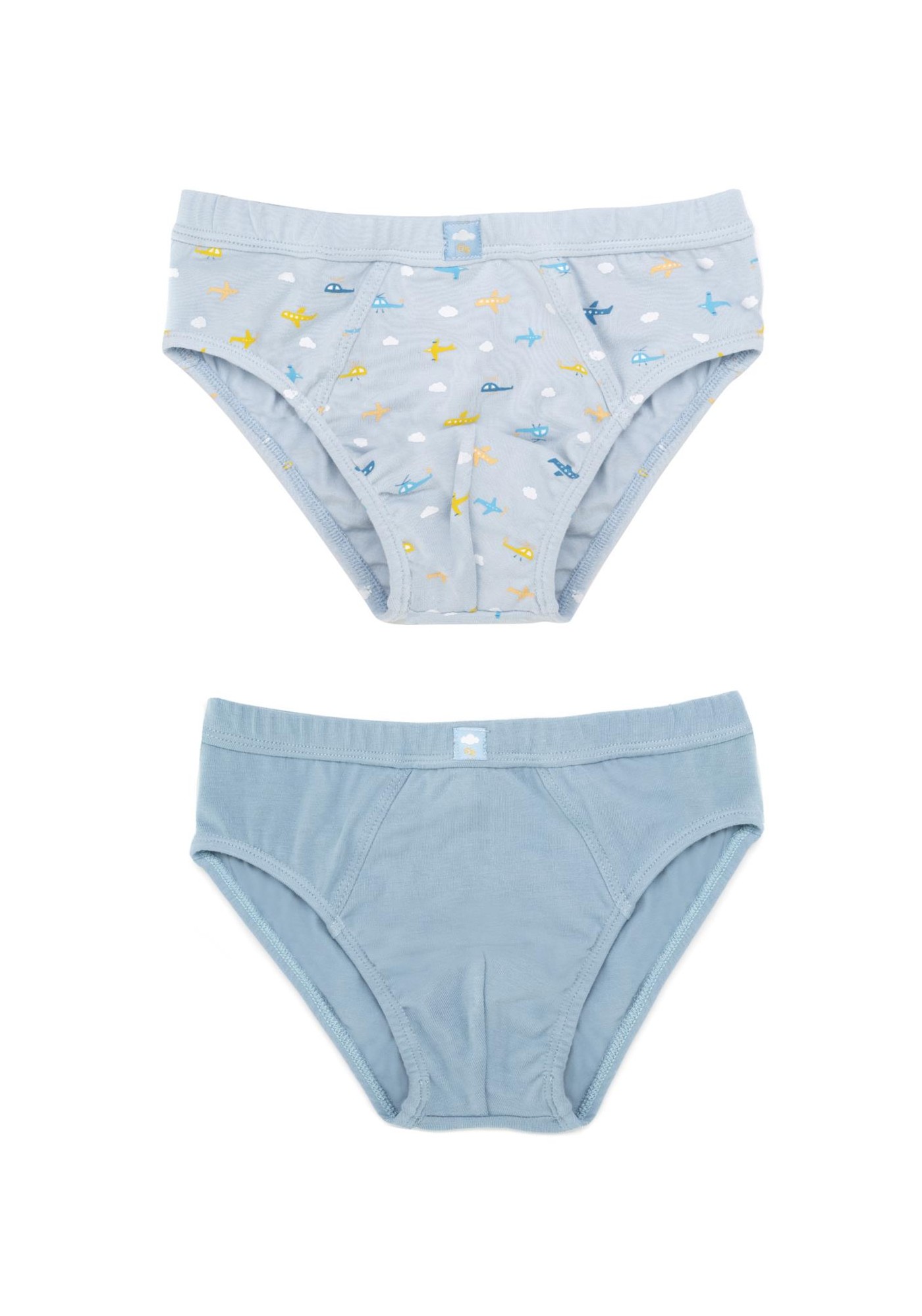 Pack de dos slips de niño combinando uno estampado con helicópteros y aviones y otro liso en color azul. 95º/ₒ Algodón 5º/ₒ Elastano - Single Jersey