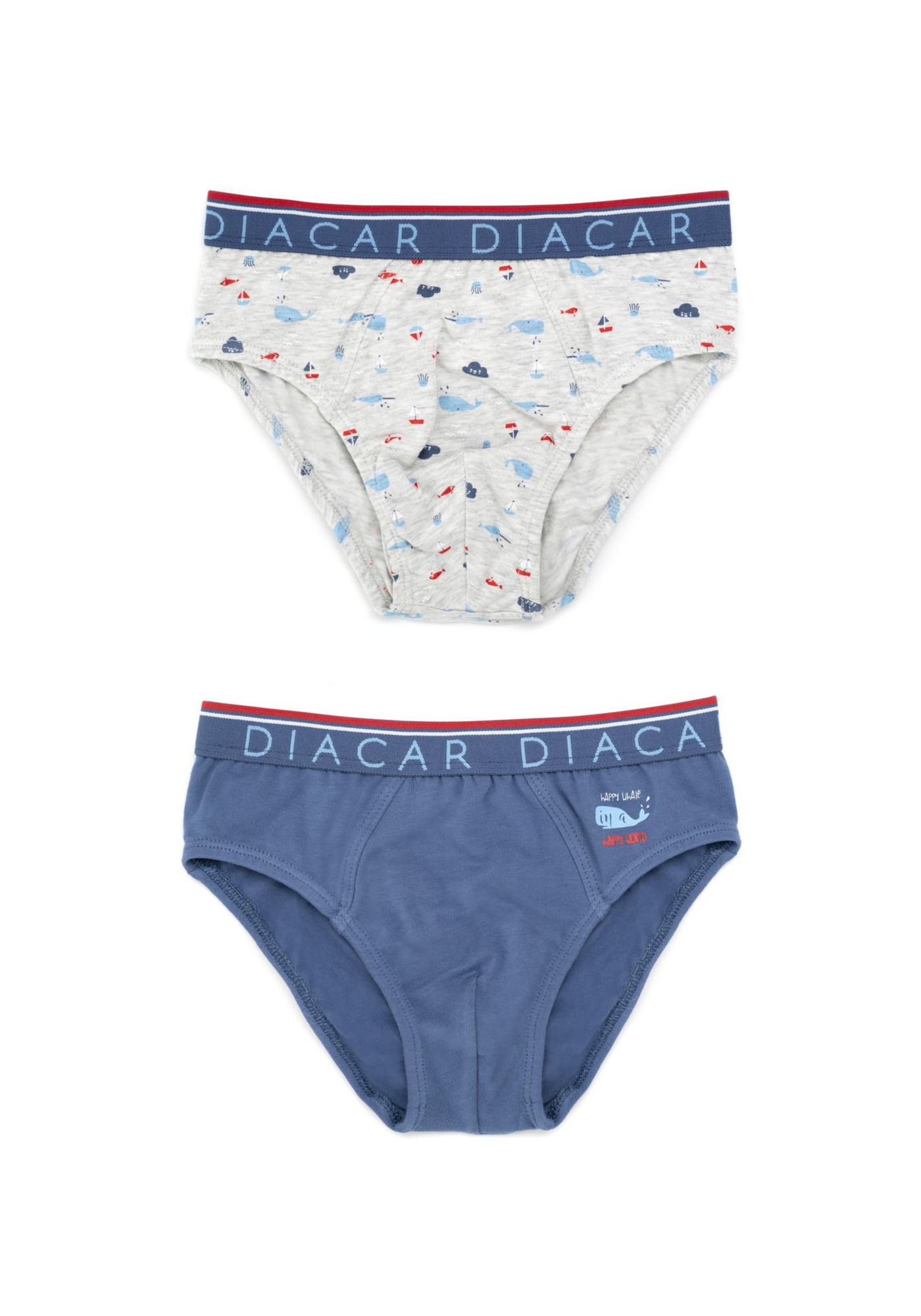 Pack de dos slips de niño combinando un slip liso con otro estampado con varios animales marinos en color azul. 95º/ₒ Algodón 5º/ₒ Elastano - Single Jersey