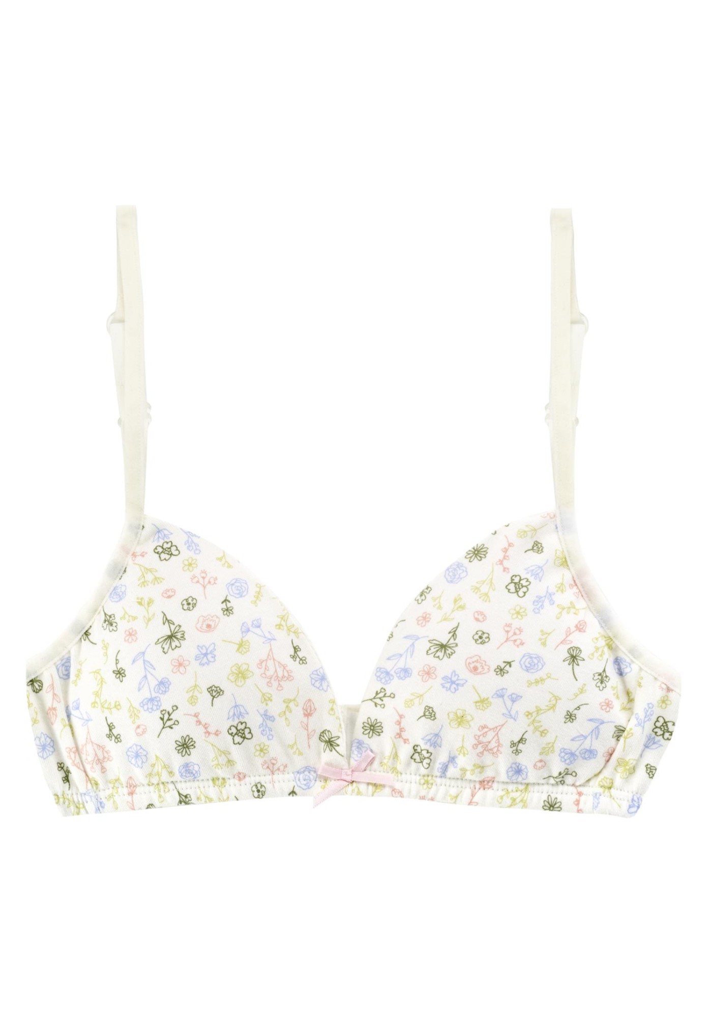 Sujetador de niña estampado de flores con relleno extraíble en color cava. rosa y azul. Confeccionado en tejido suave con sujeción suave. Ideal para el primer sujetador. 95º/ₒ Algodón 5º/ₒ Elastano - Single Jersey