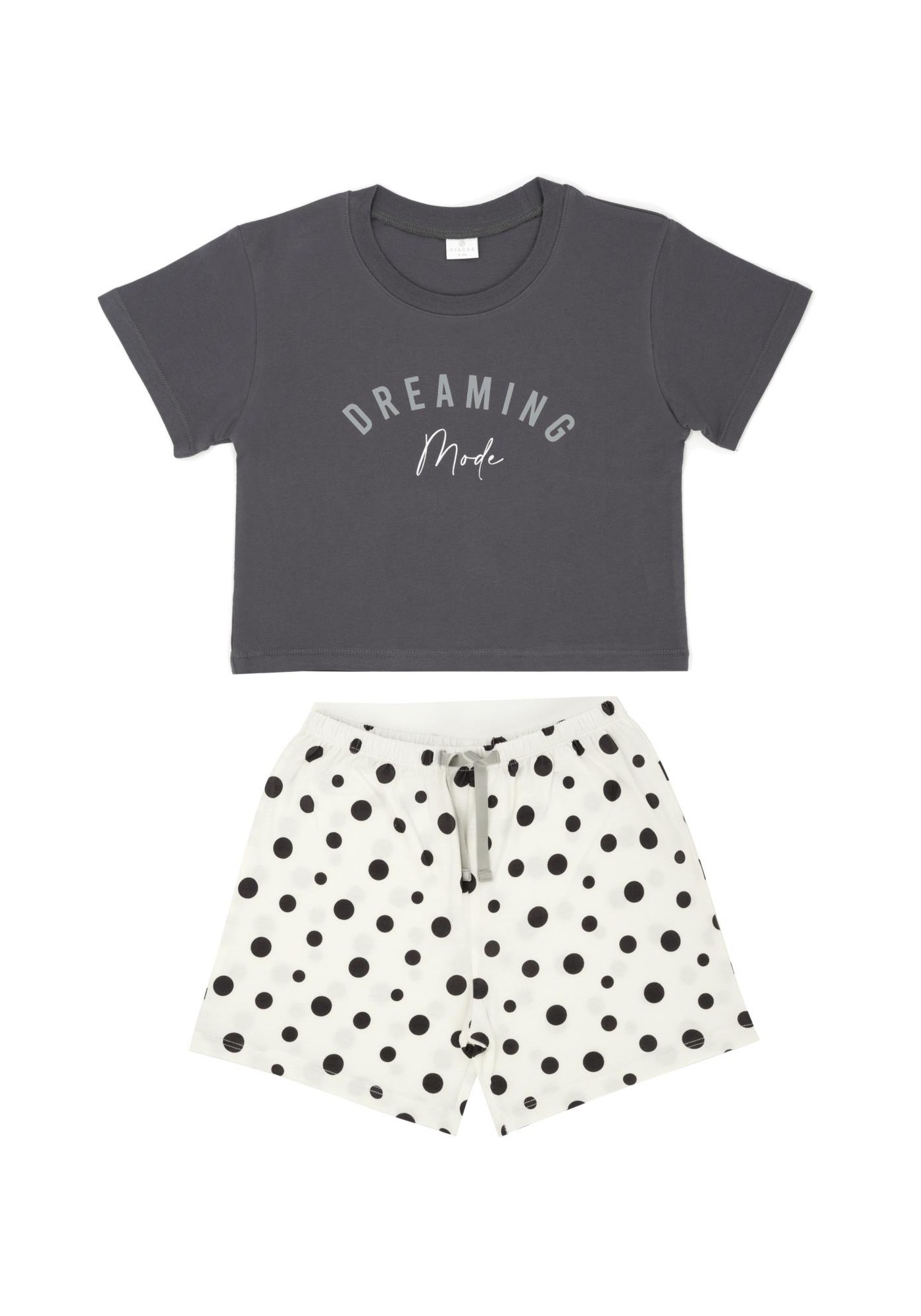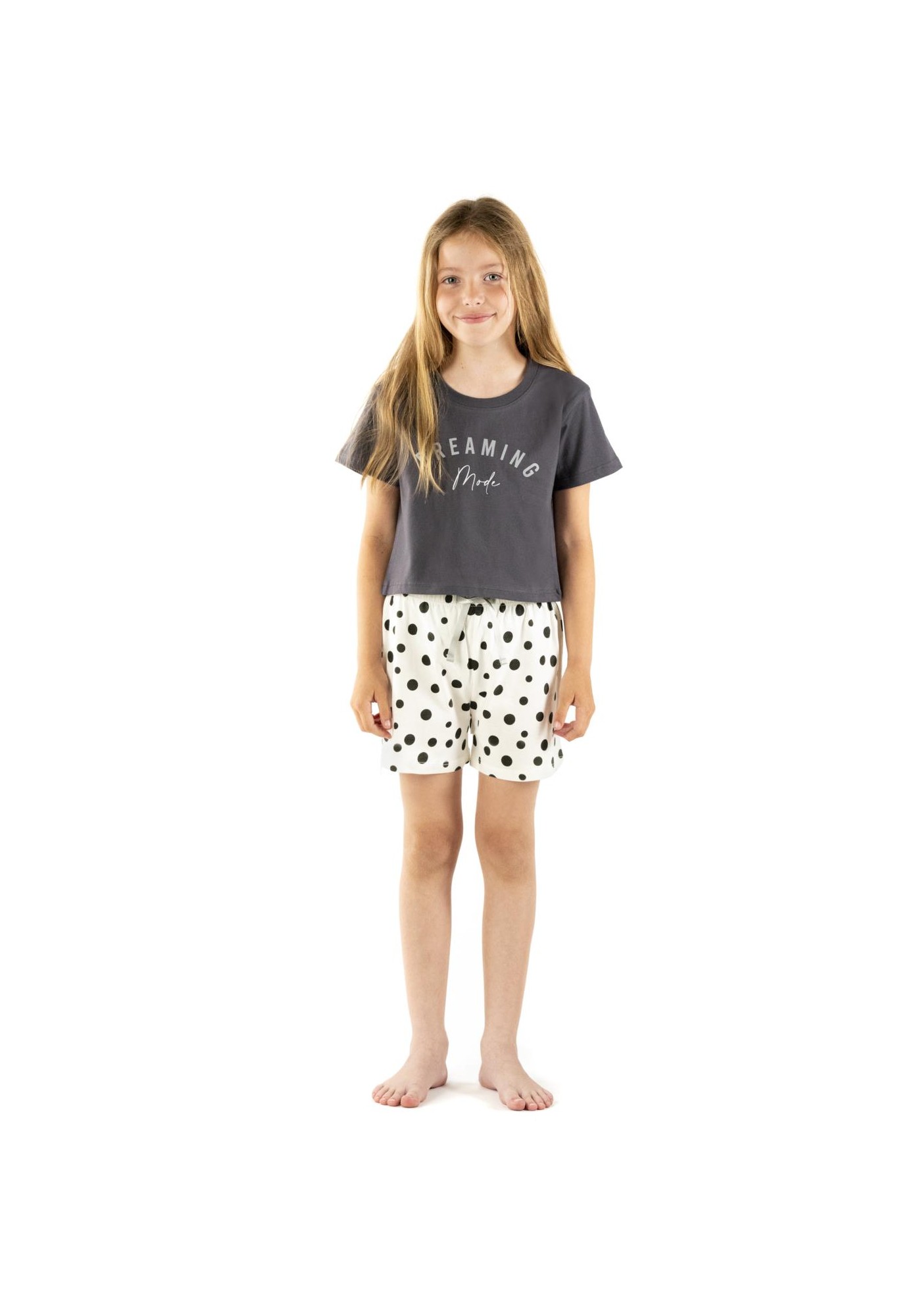Girl pajamas made of colored knitted in contrast pants with large pants full of polka dots. Short-sleeves and short pants pajamas. 100º/ₒ Cotton - Single Jersey