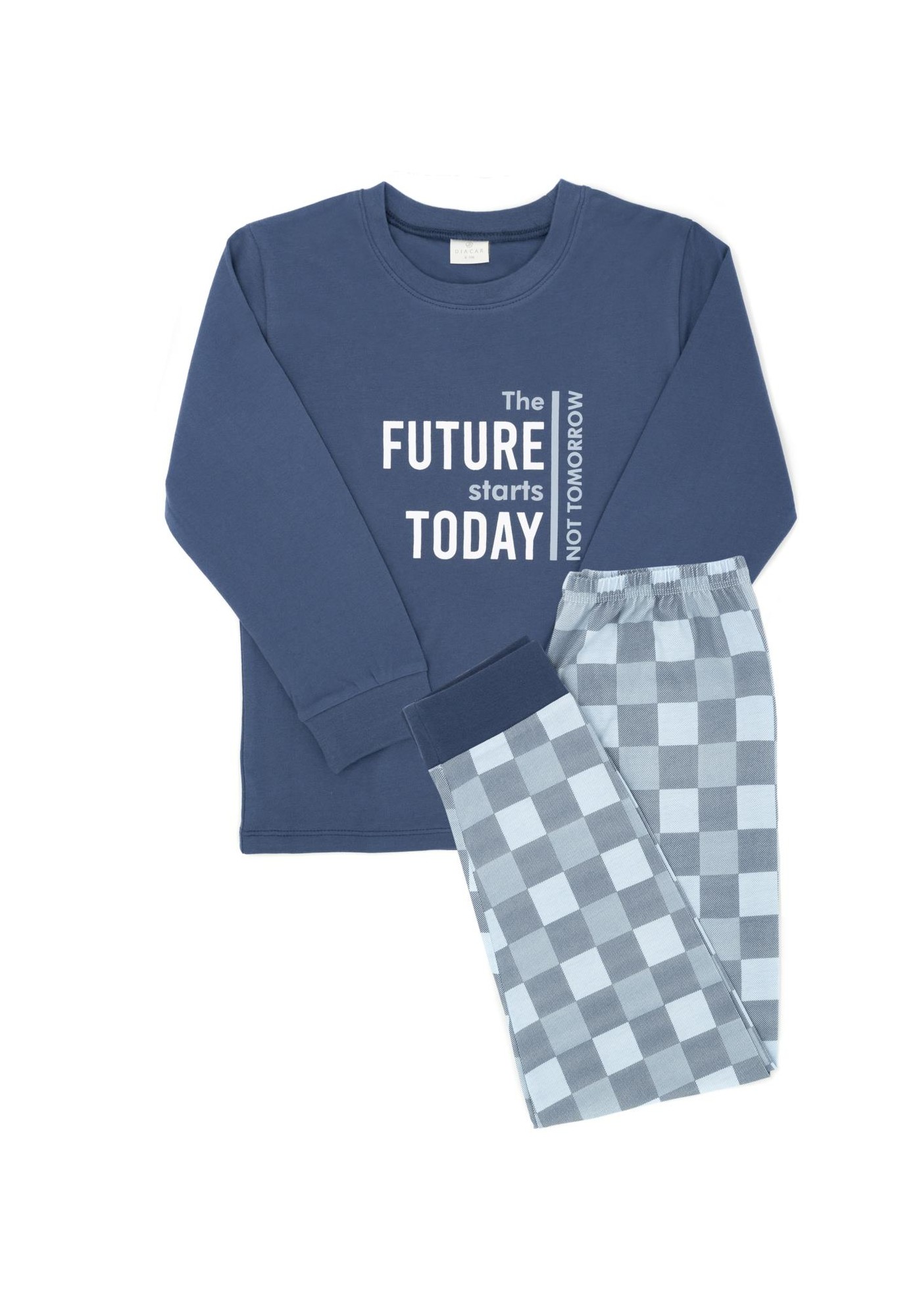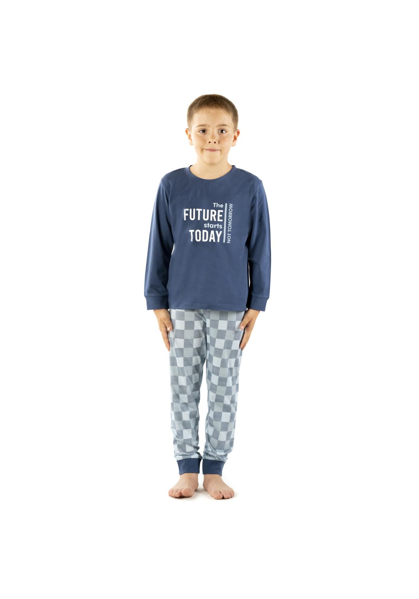 Two-piece boy pajamas with a long-sleeved smooth t-shirt combined with blue chess stamped pants in blue. 100º/ₒ Cotton - Single Jersey