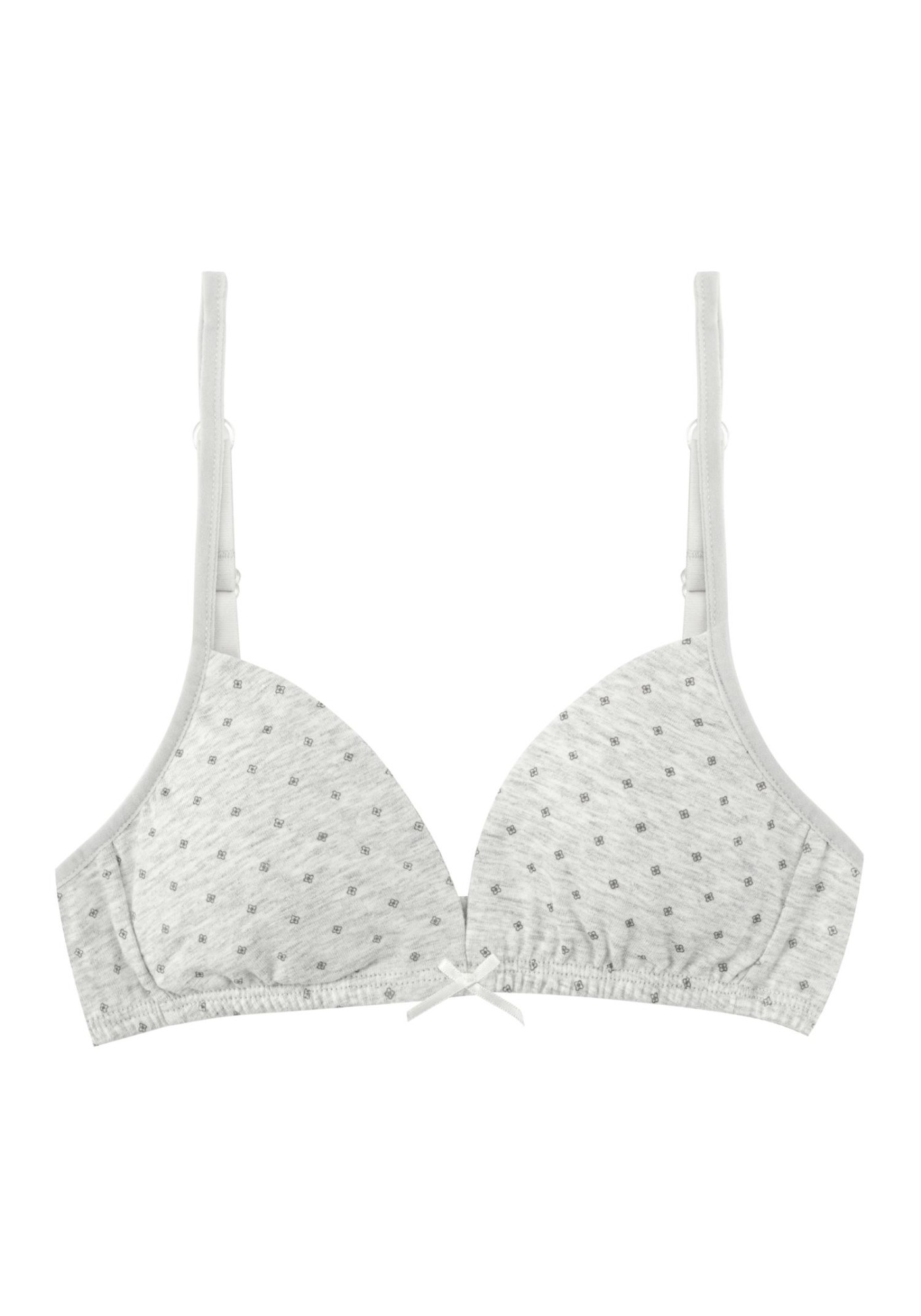 Girl's bra printed with flowers in grey color. Made of soft fabric with soft support. Ideal for the first setting.